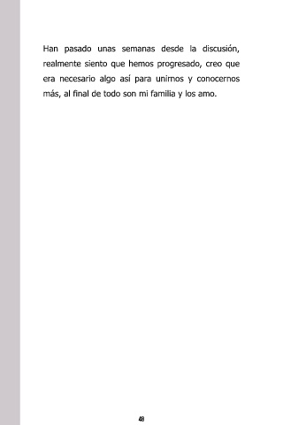 Han pasado unas semanas desde la discusión, realmente siento que hemos progresado, creo que era necesario algo así para unirnos y conocernos más, al final de todo son mi familia y los amo. 48