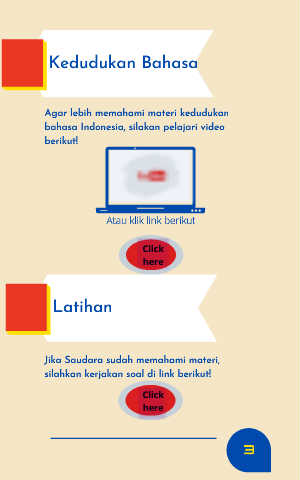 Kedudukan Bahasa Agar lebih memahami materi kedudukan bahasa Indonesia, silakan pelajari video berikut! Atau klik link berikut Click here Latihan Jika Saudara sudah memahami materi, silahkan kerjakan soal di link berikut! Click here 3
