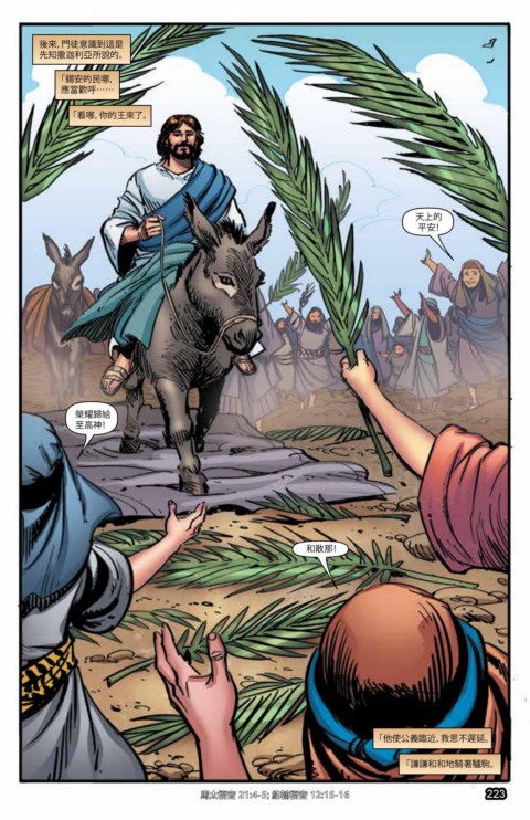 馬太福音 21:8-9; 馬可福音 11:8-10; 路加福音19:36-38; 約翰福音 12:12-13 馬太福音 21:4-5; 約翰福音 12:15-16 223
