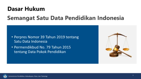 Dasar Hukum 3 Semangat Satu Data Pendidikan Indonesia • Perpres Nomor 39 Tahun 2019 tentang Satu Data Indonesia • Permendikbud No. 79 Tahun 2015 tentang Data Pokok Pendidikan 3 Kementerian Pendidikan, Kebudayaan, Riset, dan Teknologi