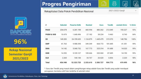 Progres Pengiriman 96% Rekap Nasional Semester Ganjil 2021/2022 10 Kementerian Pendidikan, Kebudayaan, Riset, dan Teknologi