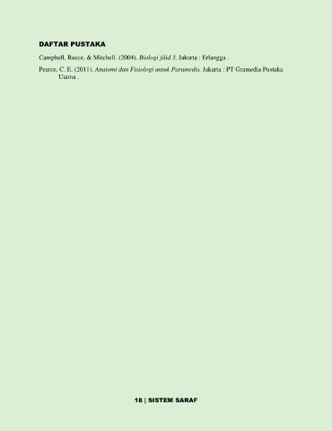 DAFTAR PUSTAKA Campbell, Reece, & Mitchell. (2004). Biologi jilid 3. Jakarta : Erlangga . Pearce, C. E. (2011). Anatomi dan Fisiologi untuk Paramedis. Jakarta : PT Gramedia Pustaka Utama . 18 | SISTEM SARAF