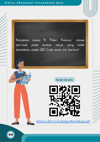S i k l u s A k u n t a n s i P e r u s a h a a n J a s a Kerjakan kasus 5 "Febri Fashion" sesuai perintah pada lembar kerja yang telah disediakan pada QR Code atau link berikut! Scan di sini: https://bit.ly/LembarKerjaKasus5 44