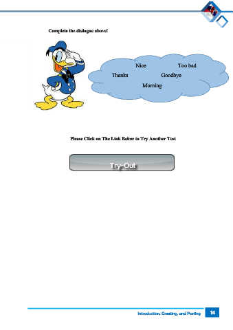 Complete the dialogue above! Nice Too bad Thanks Goodbye Morning Please Click on The Link Below to Try Another Test Introduction, Greeting, and Parting 14