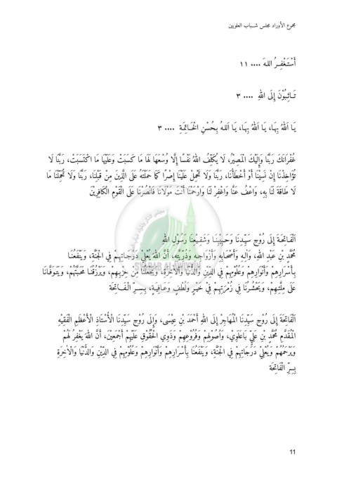 ا َل ْفَا ِتح َة َ ِإ ل َى رُ ْو ِح َسي ِّدِن َا الْم ُهَا ِج ْر ِإ ل َى اللهِ َأ ْحم َدَ ب ْ ِن عِيْس َى ،وِإَ ل َى رُ ْو ِح َسي ِّدِن َا ا ْلُأ ْست َاذِ ا ْلَأ ْعظَ ِم ال ْفَق ِيْهِ