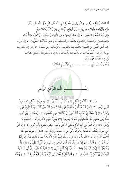َأ لفَـاتحة ،وَ ق ِرَأَةِ سورَة يس و ال َت ّـ ْهل ِيل إل َى َحضرَةِ الن َبِ ِي الم ُصطَفَى مح َم َ ٍد َصل َى ال َل ّـه ع َل َيهِ وَ َسل َمَ