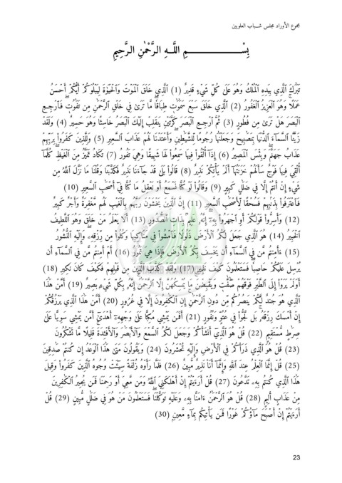 ۡحسَ ُن َأ ُي ّكُ ۡم َأ ل ِي َبۡل ُو َك ُ ۡم وَٱ ۡلحيَ َ ٰوةَ ٱلۡم َوۡ َت خَل َ َق ٱلَ ّذِي ()1 ٌ ق َدِير ش َ ۡيءٍ كُ ِّل ع َل َى َ وَه ُو ٱلۡم ُلۡ ُك بيِ َدِهِ ٱلَ ّذِي ت َب َٰرَكَ