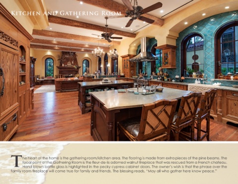 t he heart of the home is the gathering room/kitchen area. The flooring is made from extra pieces of the pine beams. The
