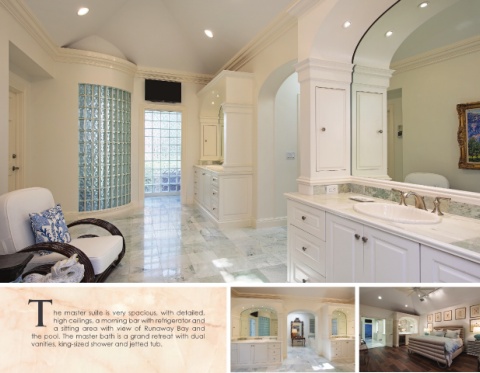 T he master suite is very spacious, with detailed, high ceilings, a morning bar with refrigerator and a sitting area with view of Runaway Bay and the pool. The master bath is a grand retreat with dual vanities, king-sized shower and jetted tub.