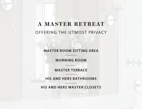 A MASTER RETREAT OFFERING THE UTMOST PRIVACY MASTER ROOM SITTING AREA MORNING ROOM MASTER TERRACE HIS AND HERS BATHROOMS HIS AND HERS MASTER CLOSETS