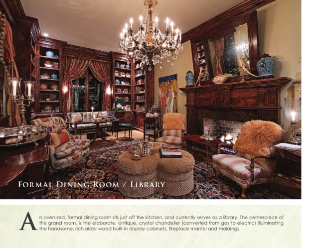 A n oversized, formal dining room sits just off the kitchen, and currently serves as a library. The centerpiece of