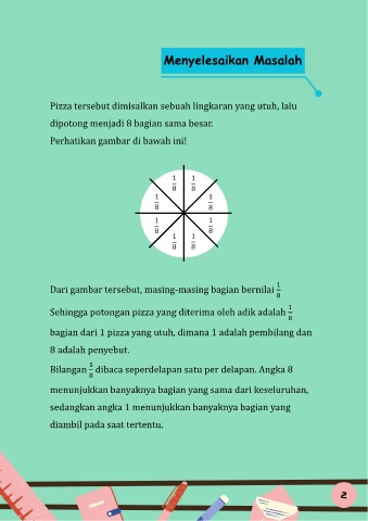 bagian dari 1 pizza yang utuh, dimana 1 adalah pembilang dan