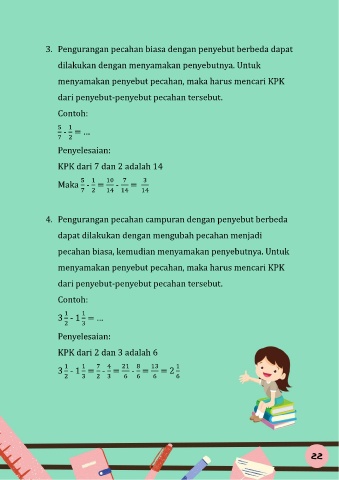 3. Pengurangan pecahan biasa dengan penyebut berbeda dapat