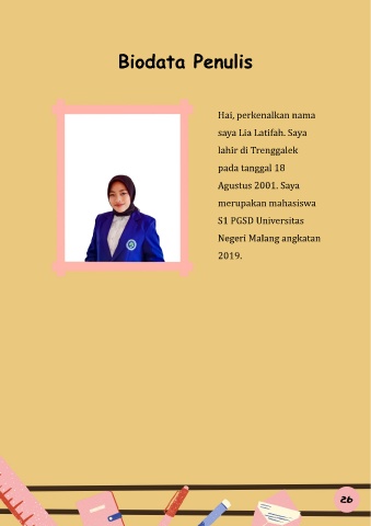 Biodata Penulis Hai, perkenalkan nama saya Lia Latifah. Saya lahir di Trenggalek pada tanggal 18 Agustus 2001. Saya merupakan mahasiswa S1 PGSD Universitas Negeri Malang angkatan 2019.