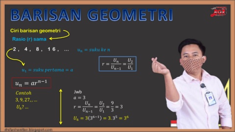 Ciri barisan geometri Rasio (r) sama 2 , 4 , 8 , 1 6 , … = 2 = = = = −1 1 1 = −1 ℎ Jwb = 3 3,9, 27,, … 9 ?… = −1 = 2 = 3 = 3 6 1 5 6 = 3 3 6−1 = 3. 3 = 3 6