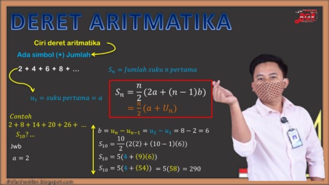 Ciri deret aritmatika Ada simbol (+) Jumlah 2 + 4 + 6 + 8 + … = ℎ = (2 + − 1 ) = = 2 1 = ( + ) ℎ 2 2 + 8 + 14 + 20 + 26 + … = − = − = 8 − 2 = 6 ?… 10 −1 2 1 10 = (2 2 + 10 − 1 6 ) Jwb 10 2 = 2 10 = 5(4 + 9 6 ) 10 = 5(4 + 54 ) = 5(58) = 290