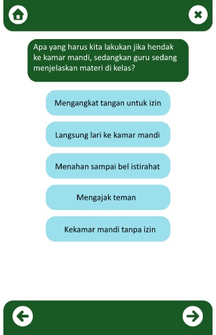Apa yang harus kita lakukan jika hendak ke kamar mandi, sedangkan guru sedang menjelaskan materi di kelas? Mengangkat tangan untuk izin Langsung lari ke kamar mandi Menahan sampai bel istirahat Mengajak teman Kekamar mandi tanpa izin