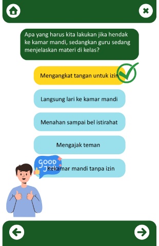 Apa yang harus kita lakukan jika hendak ke kamar mandi, sedangkan guru sedang menjelaskan materi di kelas? Mengangkat tangan untuk izin Langsung lari ke kamar mandi Menahan sampai bel istirahat Mengajak teman Kekamar mandi tanpa izin
