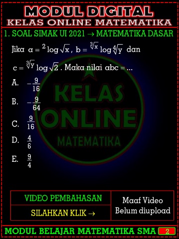 1. SOAL SIMAK UI 2021 → MATEMATIKA DASAR 4 Jika a = 2 log x , b = 3 x log y dan 3 y = c = log 2 . Maka nilai abc ... A. − 9 16 B. − 9 64 9 C. 16 D. 4 6 E. 9 4 VIDEO PEMBAHASAN Maaf Video SILAHKAN KLIK → Belum diupload MODUL BELAJAR MATEMATIKA SMA 2