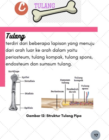 C TULANG Tulang terdiri dari beberapa lapisan yang menuju dari arah luar ke arah dalam yaitu periosteum, tulang kompak, tulang spons, endosteum dan sumsum tulang. Gambar 12: Struktur Tulang Pipa 17
