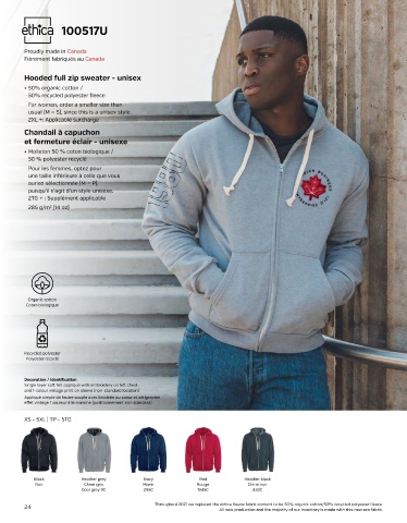 24 Throughout 2021 we replaced the ethica fleece fabric content to be 50% organic cotton/50% recycled polyester fleece . En 2021, nous avons remplacé le molleton ethica par un tissu composé de 50 % coton biologique et de 50 % polyester recyclé . 25