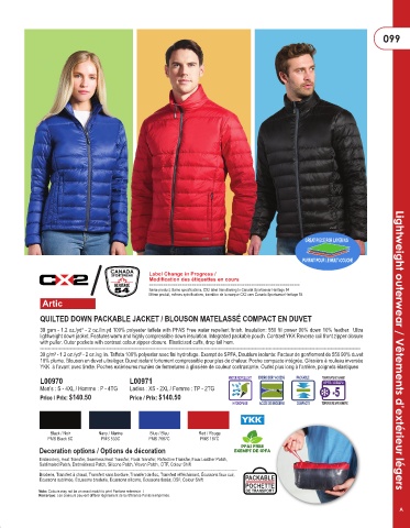 39 g/m² - 1.2 oz./yd² - 2 oz./vg lin. Taffeta 100% polyester avec fini hydrofuge. Exempt de SPFA, Doublure isolante: Facteur de gonflement de 550 90% duvet Lightweight outerwear / Vêtements d’extérieur légers