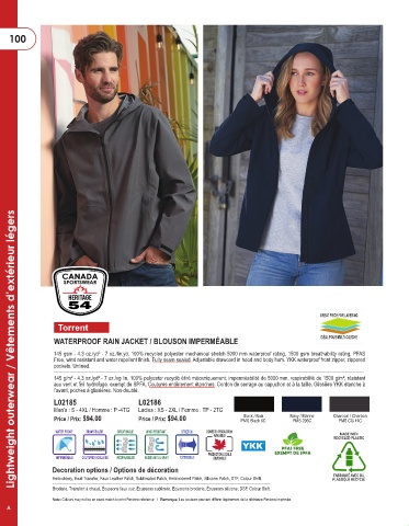 145 g/m² - 4.3 oz./yd² - 7 oz./vg lin. 100% polyester recyclé étiré mécaniquement, imperméabilité de 5000 mm, respirabilité de 1500 g/m², résistant
