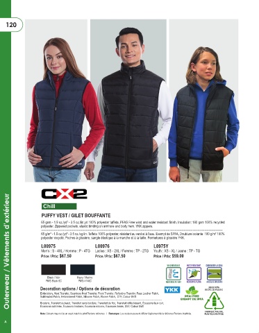 65 gsm - 1.9 oz./yd² - 3.5 oz./lin.yd 100% polyester taffeta, PFAS Free wind and water resistant finish. Insulation: 180 gsm 100% recycled