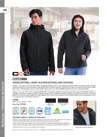 respirabilité de 2000 g/m², résistant aux vent, fini hydrofuge exempt de SPFA, et résistant à l’abrasion. Extensible pour faciliter les mouvements. Capuche at-