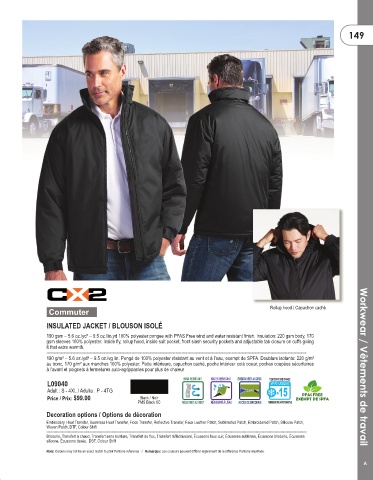 au tronc, 170 g/m² aux manches 100% polyester. Patte intérieure, capuchon caché, poche intérieur coté coeur, poches coupées sécuritaires