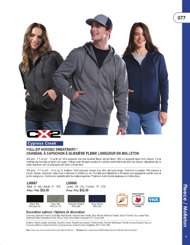 260 gsm - 7.7 oz./yd² - 13 oz./lin.yd 100% polyester one side brushed fleece, anti-pill finish. YKK coil exposed zipper front closure. 2 tone
