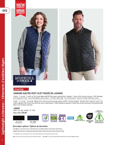37 gsm – 1.1 oz./yd² – 2 oz./lin. yd 100% nylon taffeta with PFAS free water repellent finish. Insulation: 140 gsm 100% recycled polyester. YKK front zipper
