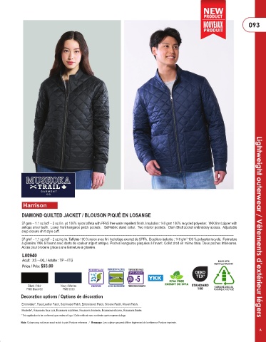 37 gsm – 1.1 oz./yd² – 2 oz./lin. yd 100% nylon taffeta with PFAS free water repellent finish. Insulation: 140 gsm 100% recycled polyester. YKK front zipper with