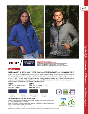 YKK front zipper. Zippered side entry pockets. Zipper detachable Hood. Zocket embroidery access. Black elastic binding at hood opening and cuff. Lightweight outerwear / Vêtements d’extérieur légers