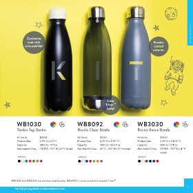 WB1030 and WB3030 are stainless steel bottles, WB8092 is constructed with durable Tritan TM