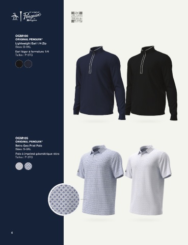 OGM100 ORIGINAL PENGUIN ® Lightweight Earl 1/4 Zip Sizes: S-3XL Earl léger à fermeture 1/4 Tailles : P-3TG OGM105 ORIGINAL PENGUIN ® Retro Geo Print Polo Sizes: S-3XL Polo à imprimé géométrique rétro Tailles : P-3TG 6