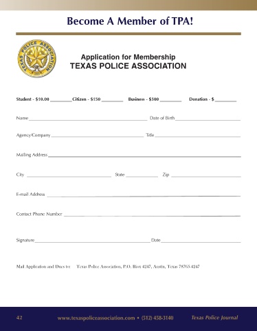 Mail Application and Dues to: Texas Police Associati on, P.O. Biox 4247, Austin, Texas 78765-4247