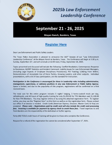 Forty (40) TCOLE credit hours of training will be given to those who complete the Conference.