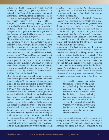 exhibits a deadly weapon[.]” TEX. PENAL he did not let go of the cooler, Appellant might use
