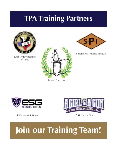 TPA Training Partners Shooter Performance Institute Robbery Investigators of Texas Patriot Protection ESG Secure Solutions A Girl and a Gun Join our Training Team!