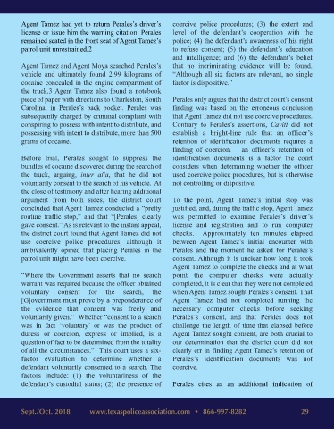 Agent Tamez had yet to return Perales’s driver’s coercive police procedures; (3) the extent and