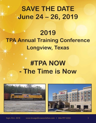 SAVE THE DATE June 24 – 26, 2019 2019 TPA Annual Training Conference Longview, Texas #TPA NOW - The Time is Now Sept./Oct. 2018 www.texaspoliceassociation.com • 866-997-8282 3