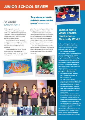 events such as the Aladdin Program Cover Competition and the Art Show Personally the Aladdin Program Cover Competition was the highlight of my year I loved seeing kids from all year levels participate in in such an engaging competition and will forever remember the look on everyone’s faces when the winner was announced This experience taught me not to judge but to accept that each person has a a a a a different unique style of art art No one’s art art can ever be perfect but to have a a different ‘The greatnessof art isnot to find what what iscommon but what what isunique ’ Isaac Bashevis Singer