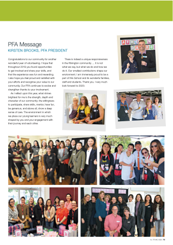 to get involved and and share your skills and and that the experience was fun and rewarding I also hope you feel proud and satisfied with your your efforts and recognise your your value to our our our community Our PFA continues to evolve and strengthen thanks to your involvement As I reflect upon this year what shines brightest for me is the strength depth and character of our community the willingness to to participate share skills mentor have fun be generous and above all show a a a a deep sense of care The environment in which we place our young learners is very much shaped by you you and your engagement with their journey and each other There is indeed a unique responsiveness in in the Kilvington community it it is not what what we we we say but what what we we we do and how we we we do it Our smallest contributions shape our environment I am immensely proud to be a a part of this School and its wonderful families staff and students Thank you I very much look forward to 2020 AL ITTIHAD 2020 /18