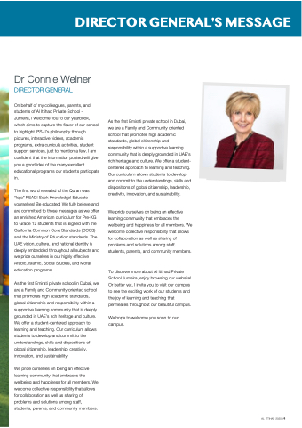 Jumeira I welcome you to our yearbook which aims to capture the flavor of our school to highlight IPS-J’s philosophy through pictures interactive videos academic programs extra curricula activities student support services just to mention a a few I am confident that the information posted will give you a a a good idea of the many excellent educational programs our students participate in The first word revealed of the Quran was “Iqra” READ! Seek Knowledge! Educate yourselves! Be educated! We fully believe and are committed to these messages as we offer an an enriched American curriculum for Pre-KG to Grade 12 students that is aligned with the California Common Core Standards (CCCS) and and the Ministry of Education standards The UAE vision culture and national identity is is deeply embedded throughout all subjects and we pride ourselves in our our highly effective Arabic Islamic Social Studies and Moral education programs As the first Emirati private school in Dubai we are a a a a Family and Community oriented school that promotes high academic standards global citizenship and responsibility within a a a supportive learning community that is deeply grounded in UAE’s rich heritage and culture We offer a a a student-centered approach to learning and teaching Our curriculum allows students to to develop and commit to to the understandings skills and and dispositions of global citizenship leadership creativity innovation and sustainability We pride ourselves on being an effective learning community that embraces the wellbeing and happiness for all members We welcome collective responsibility that allows for collaboration as as well as as sharing of problems and solutions among staff students parents and community members As the first Emirati private school in Dubai we are a a a a Family and Community oriented school that promotes high academic standards global citizenship and and responsibility within a a supportive learning community that is deeply grounded in UAE’s rich heritage and culture We offer a a a student- centered approach to learning and teaching Our curriculum allows students to develop and and and commit to the understandings skills and and and dispositions of global citizenship leadership creativity innovation and sustainability We pride ourselves on being an effective learning community that embraces the wellbeing and happiness for all members We welcome collective responsibility that allows for collaboration as as well as as sharing of problems and solutions among staff students parents and community members To discover more about Al Ittihad Private School Jumeira enjoy browsing our website! Or better yet I invite you to visit our campus to see the exciting work of our students and the joy of learning and teaching that permeates throughout our beautiful campus We hope to to welcome you soon to to our campus AL