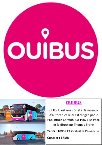 OUIBUS OUIBUS est une société de réseaux d’autocar, celle-ci est dirigée par le PDG Bruce Cartson, Co-PDG Elsa Pearl et le directeur Thomas Brohn Tarifs : 1000€ ET Gratuit le Dimanche Contact : 123Hz