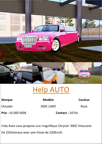 Help AUTO Marque Modèle Couleur Chrysler 300C LIMO Rose Prix : 16 000 000€ Contact : 247Hz Help Auto vous propose une magnifique Chrysler 300C limousine De 250chevaux avec une Vmax de 220Km/h.
