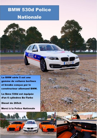 BMW 530d Police Nationale La BMW série 5 est une gamme de voitures berlines et breaks conçus par le constructeur allemand BMW. La Bmw 530d est équipée d’un 6 cylindres Be-Turbo Diesel de 265ch Merci à la Police Nationale