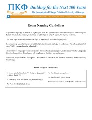 Room Naming Guidelines If you make a pledge of $5,000 or higher, you have the opportunity to have a room/space named in your honor, in honor of a brother, in memory of a brother, or for a Pi Kappa Phi Family Member. The Steering Committee reserves the right to approve all room naming requests. Room naming opportunities are available based on the date a pledge is confrmed. Therefore, please list your TOP 3 choices in order of priority. There will be a plaque placed inside or at the entrance to each naming area, as determined by the Campaign Steering Committee. The plaques will be placed so that they are easily seen. Names on plaques should be kept to a maximum of 24 letters and must be approved by the Steering Committee ROOM PLAQUE EXAMPLES: In Honor of John Doe Smith ’94 (living or deceased)* The Doe Family Living Room by Mister Smith ‘96 The Smith Family Dining Room In Memory of John Doe Smith ’94 (deceased only)* *Initiation year will be used after the alumni’s name The John Doe Smith Study Room