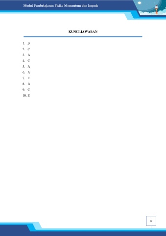 Modul Pembelajaran Fisika Momentum dan Impuls KUNCI JAWABAN 1. B 2. C 3. A 4. C 5. A 6. A 7. E 8. B 9. C 10. E 37